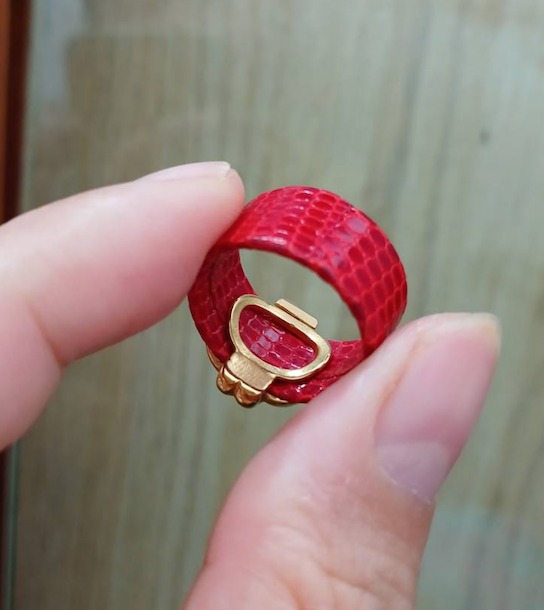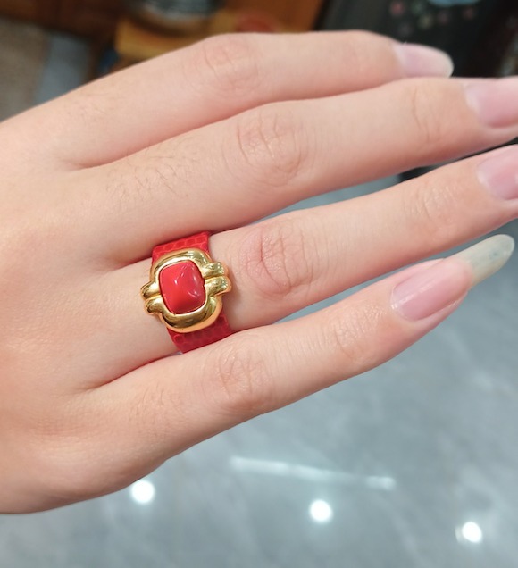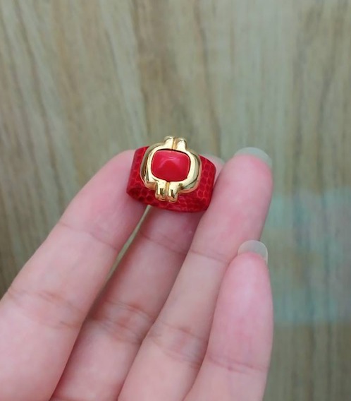 Nhẫn Nữ bọc da, Mặt bọc vàng 47%, đính đá đỏ lên tay cực sang