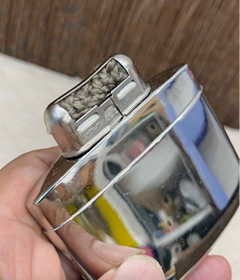 Bước 2: Châm lửa cho bật lửa sưởi bằng lửa mồi. Ban đầu để lửa tự cháy lớn cho đến khi tự tắt, lúc đó lửa đã chuyển sang cháy âm ỉ bên trong bật lửa.